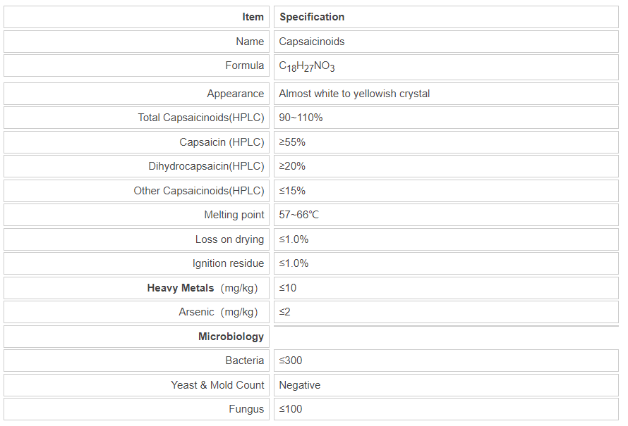 Capsaicinoids and chili peppers is caused alkali dihydrogen spicy flavor of the main chemical substances, low levels of product forms such as Capsicum, capsaicin is widely used as a food additive in the food industry. And when they are further purified, it has many biological activities, and have strong and long-lasting anti-inflammatory analgesic effect. Capsaicinoids oral administration can promote the secretion of gastric juice, increase appetite, relieve flatulence, improve digestion and promote blood circulation; Capsaicinoids topical to treat toothache, muscle pain, rheumatism and skin diseases such as, for treatment of neuropathic pain have a significant effect, with a Capsaicinoids made ointment for chronic rheumatoid arthritis, shingles, neuralgia, bruises, etc. have a significant effect; Capsaicinoids for psoriasis, alopecia have good therapeutic effect; combination with morphine analgesia can be extended; Capsaicinoids manufacturing in the military as tear gas, tear gas guns and defensive weapons, the main raw material. In the next few years, domestic and foreign Capsaicinoids application will be expanding rapidly and a broad market prospect.