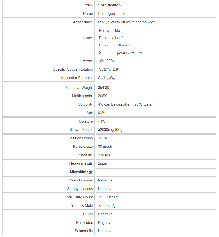 Natural Chlorogenic acid is a welcome collection of new and efficient phenol-type antioxidants. Chlorogenic acid can improve the stability of food antioxidant, an increase of shelf life. Chlorogenic acid has the aroma and color protection, can be used fresh food and fruits. In some foods it can replace or partially replace the commonly used synthetic antioxidants. Chlorogenic acid for the preservation of the fish, found that the effect is better than tea extract and α-tocopherol. Chlorogenic acid also used the fresh fruit juice, may effectively prevent the beverage and food spoilage, Chlorogenic acid can greatly improve the color of strawberries and other fresh fruit juice stability.