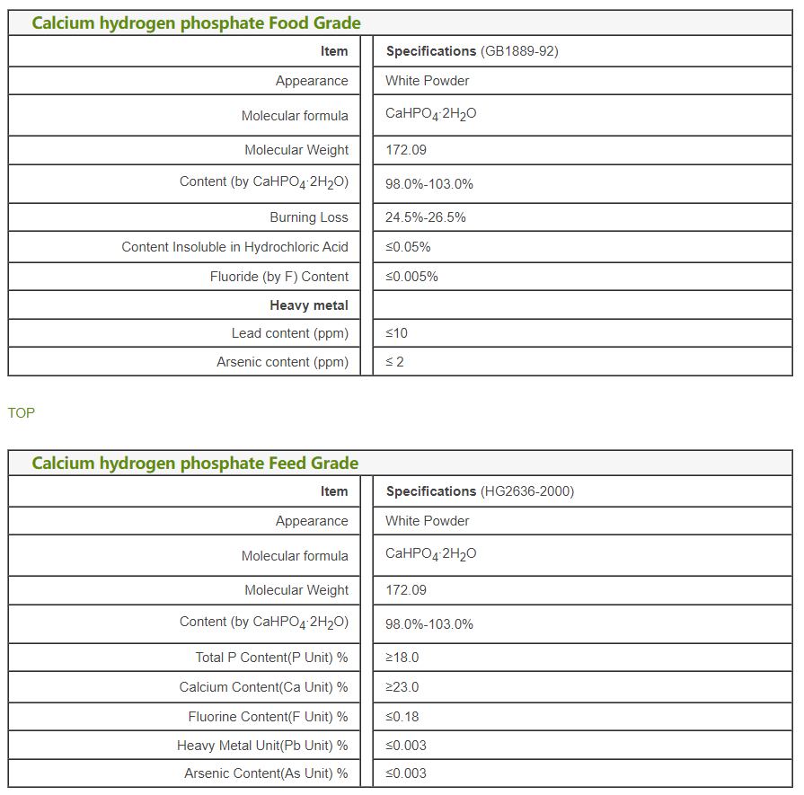 Dicalcium phosphate also known as calcium monohydrogen phosphate, is a dibasic calcium phosphate. It is usually found as the dihydrate, with the chemical formula of CaHPO4 • 2H2O, but it can be thermally converted to the anhydrous form. It contains about 29.5 percent calcium in its anhydrous form.