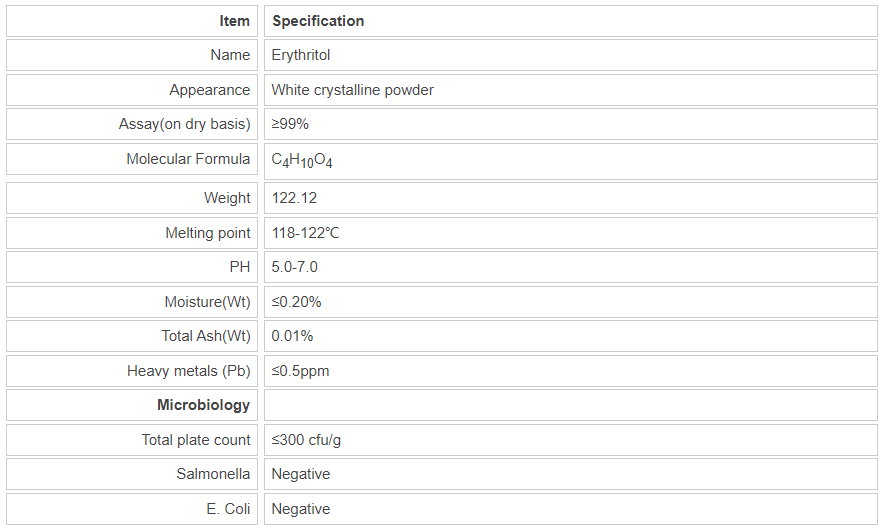 Erythritol is a low hygroscopic crystalline powder, suitable for use with saccharin, aspartame and other high-intensity sweetener mixture of table sweetener production, as Erythritol features a good sweet taste, to sample the bitter saccharin bad taste, so use Erythritol can produce a crystalline, granular, powder, flakes of non-corrosive low-calorie tabletop sweeteners.