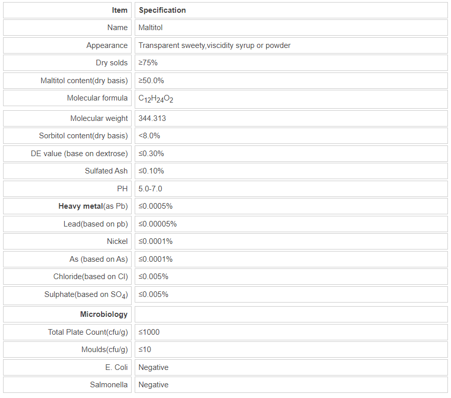 Applications:Maltitol used in food production in candy, chocolate, frozen foods, ice cream, cold drinks, pastries, juice drinks, biscuits, bread production.