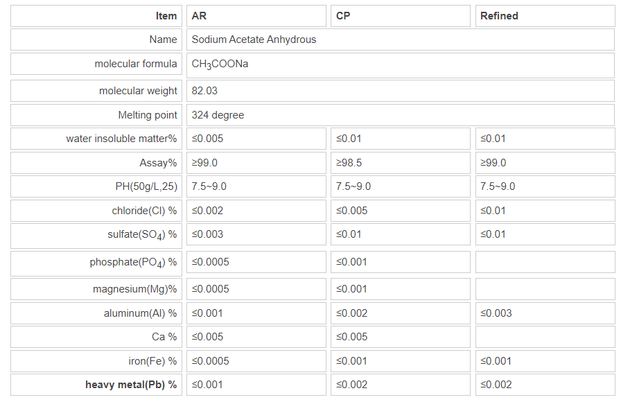 Sodium Acetate Anhydrous (food grade) C2H3NaO2 FW 82.03 content (C2H3NaO2); dry goods, dollars) 99.0-101.0% PH value of 5% aqueous solution 25 ° C 7.5-9.0 the maximum limit of free alkali (as NaOH) 0.2% Heavy metals (as Pb) 10ppm Loss on drying (120 ° C) 1.0% potassium compounds tested arsenic (As) 3 ppm.