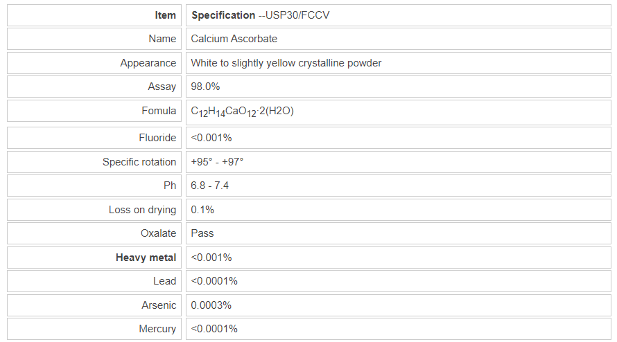 Applications:Calcium Ascorbate added to foods without changing the taste of food, can easily be added to food in the absorption of calcium, multi-use as antioxidants.