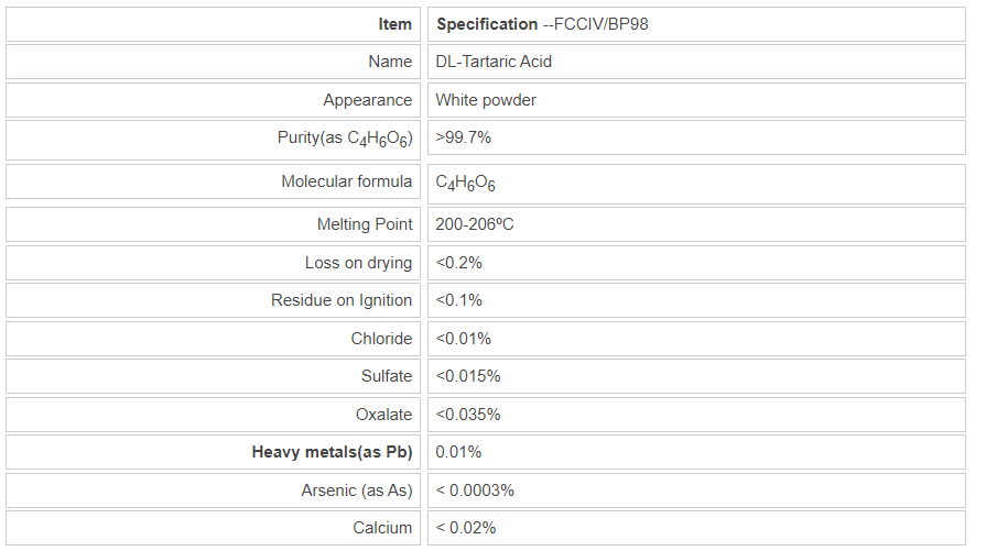 Applications:DL-Tartaric Acid used as beer foaming agent in the food industry, food acidulant, flavoring agents, sour grape juice agent. Also used for tanning, photography, glass, ceramics, telecommunications equipment.