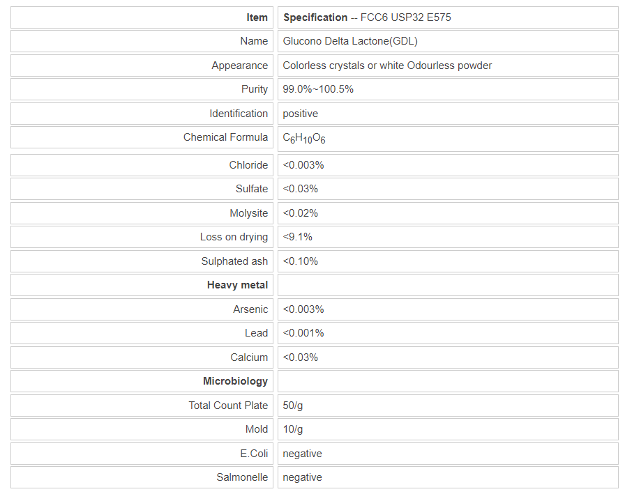 Glucono Delta Lactone as a white crystalline powder, odorless, sweet taste after the first acid, turning on the water, micro-content in ethanol. Glucono Delta Lactone protein can form a sol-gel, and a certain degree of corrosion resistance. Glucono Delta Lactone as a good multi-functional food additive, it is mainly used for protein coagulant, acid agents, bulk agents, preservatives, flavoring agents, adhesives, etc. Glucono Delta Lactone is widely used in food, daily use of chemicals, pharmaceuticals, cosmetics, metal cleaning and organic synthesis. E575 non-toxic to humans, harmless, it is a good stabilizer, coagulants, sour agent and chelating agent.