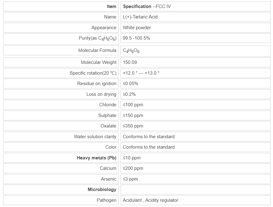 Applications:L-Tartaric Acid is widely used in wine, soft drinks, candy, bread, some jelly sweets. Mainly as sour agent, split dose and pharmaceutical raw materials.