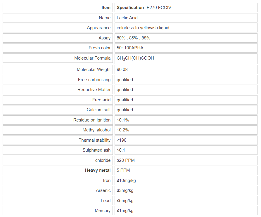 Applications:Lactic Acid used in the food and beverage, meat, cakes, cheese, ice cream, vegetables, beer, and other foods, with seasoning, antimicrobial preservative.