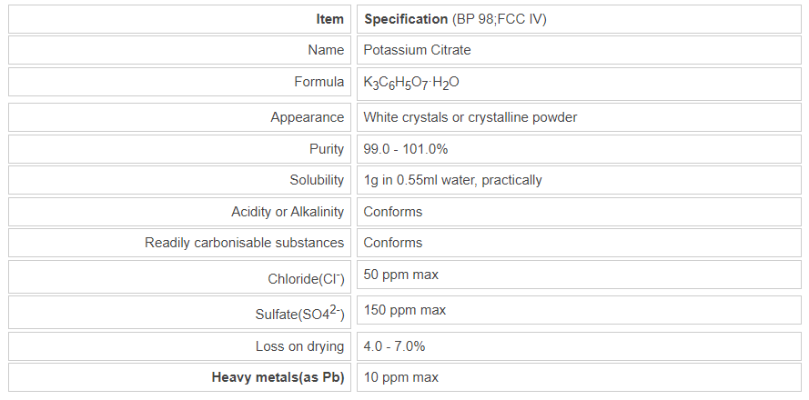 Potassium Citrate used as analytical reagent, food additive Potassium Citrate; alkaline leopoldite and pharmaceutical hypopotassemia and urine alkaline; pharmacuetical industry element of efficient fertilizer, and paper, hot stamping applications. Potassium Citrate is a potassium salt, citric acid formula C6H5K3O7. E332 is a white, slightly hygroscopic powder. Potassium Citrate is the salt taste tasteless. E332 as a food additive, Potassium Citrate is used to adjust the acidity. Medicinal, Potassium Citrate can be used to control both derived from uric acid or cystine kidney stones.