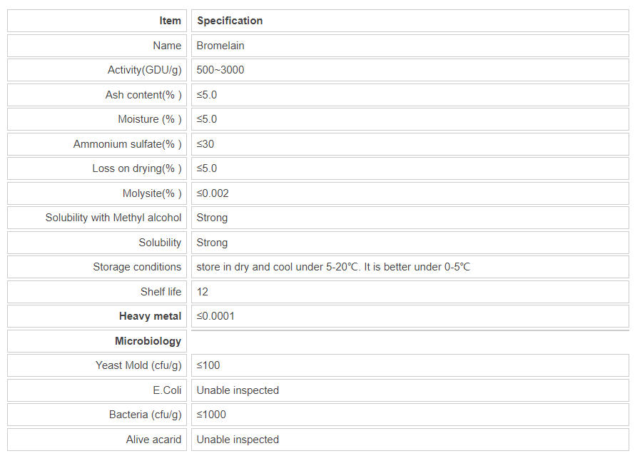Applications:Bromelain used in the food processing industry, medicine, health products industry, cosmetics industry and feed industry. Such as baked foods, meat tenderizer, candy, beverages, health products.