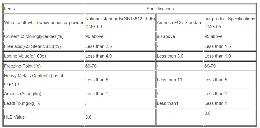 As a high quality and efficiency food emulsifier,it’s widely used as good emulsification,distribution, and stabilization in food. It has been used in the industry areas of food, medicine, household chemicals ,plastic, packaging and cosmetic etc., It is also a safe food additives which is completely non-toxic and harmless, and there is no restriction intake by the human body . DMG is the safety and high quality food additives.