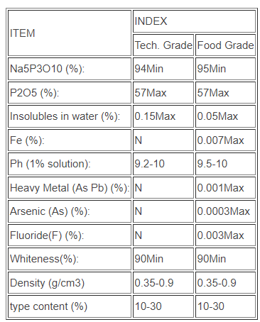 Sodium Trimetaphosphate(STMP) used as starch modifier, turbidness-preventing agent for fruit juice and drinks, water-holding agent for meat processing, water softener, adhesive agent and dispersing agent for meat, and stabilizer for ice cream, cheese and other dairy products for the sake of protecting food from discoloring and decomposing of vitamin C.The adding amount of this product in food processing is 2-4%