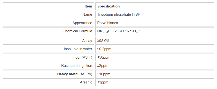 Trisodium phosphate is a cleaning agent, food additives, colorings and degreasing agent. The most common in white powder form, Trisodium phosphate, also known as trace amounts of organic acids or simply reactive phosphorus sodium phosphate. Trisodium phosphate in metallurgy, chemical, textile, printing and dyeing, paper making, mechanical and electrical industries as water softeners, boiler tube cleaning agents and detergents, metal rust inhibitors, dyes intermediates desiccant, sugar juice purification agent. Photographic developer, silk fabric enhancer, rubber latex coagulant, dental adhesives; Trisodium phosphate in pharmaceutical preparations also has a role.