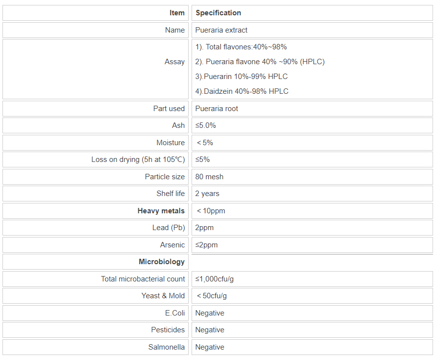 Pueraria extract can relieve muscle tension, promote blood circulation and extract decreased myocardial oxygen consumption and resist cancers. Pueraria extract can increase coronary blood flow, promote blood circulation treatment of sudden hearing loss in all age groups. Promote cardiovascular disease risk, based on Pueraria extracts widely used in food, Pueraria extract is considered quite safe. Pueraria extract is not available for those with a cold stomach and excessive sweating patients. No Pueraria extract reports of human toxicity.
