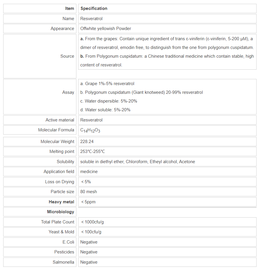 Resveratrol inhibit platelet aggregation and vasodilation to maintain blood flow, can prevent cancer and development, has anti-atherosclerosis and coronary heart disease, ischemic heart disease, high blood cholesterol in rats. Resveratrol can also inhibit tumor effect also has estrogen-like effect, for the treatment of breast cancer and other diseases. Resveratrol on obesity control and weight loss can play a role in the management of burns or hemorrhagic shock caused by decreased cardiac output and effective recovery, and can expand arteries and microcirculation. Regular consumption of Resveratrol, can alleviate cardiovascular disease, lower blood lipids, anti-aging. Resveratrol health food nutrition and health in the 21st century will be the new fashion.
