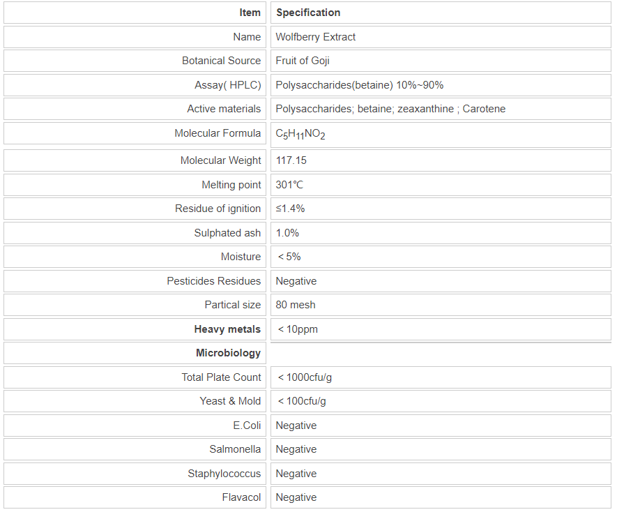 Wolfberry Extract also contains the human body with good health care and the beneficial effect of polysaccharides of human intellectual development. Wolfberry Extract with enhanced immune function and immune regulation, significantly promote hematopoietic function,Wolfberry Extract lipid-lowering, anti-fatty liver, anti-tumor, anti-aging effect.
