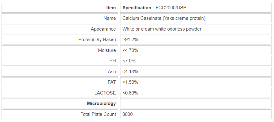 Calcium Caseinate is yak milk casein as raw materials, refined by scientific methods of extraction of natural nutritional supplements, a high-quality milk protein product,Calcium Caseinate in calcium, it is also provides essential amino acids required for the new body with calcium, protein complement of double effect. Calcium Caseinate mainly in the health care products and pharmaceutical industries as a source of additives of calcium and protein supplements are widely used, because Calcium Caseinate with thickening, emulsifying and foaming properties,Calcium Caseinate as food additives used in nutritional beverages, cheese, yoghurt and bread and other food processing industry。