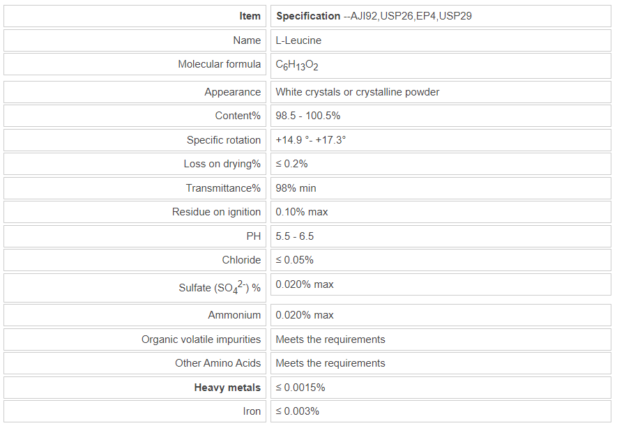 L-Leucine as a white shiny hexahedral crystals or white crystalline powder. L-Leucine slightly bitter taste. Sublimation at 145 ~ 148 ℃. Melting point 293 ~ 295 ℃ (decomposition). L-Leucine in the presence of hydrocarbons, inorganic acid in aqueous solution and stable performance. Per gram of L-Leucine dissolved in 40ml water and about 100ml acetic acid. Slightly soluble in ethanol, soluble in dilute hydrochloric acid and alkali hydroxide and carbonate solution. L-Leucine is not soluble in ether.