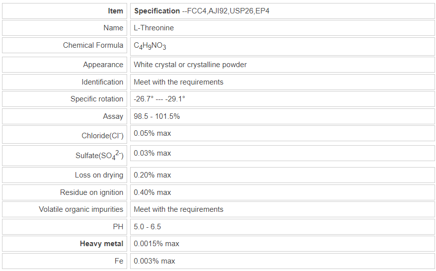 Function:L-Threonine can be used for the sedimentation of protein, participate in animal’s supersession and maintaining activities to enhance the digestion and immunocompetence of the animal. It can also adjust the balance of the amino acids in feed, enhance the efficiency of feed utilization, and lower the cost of the feed when work with other amino acids.