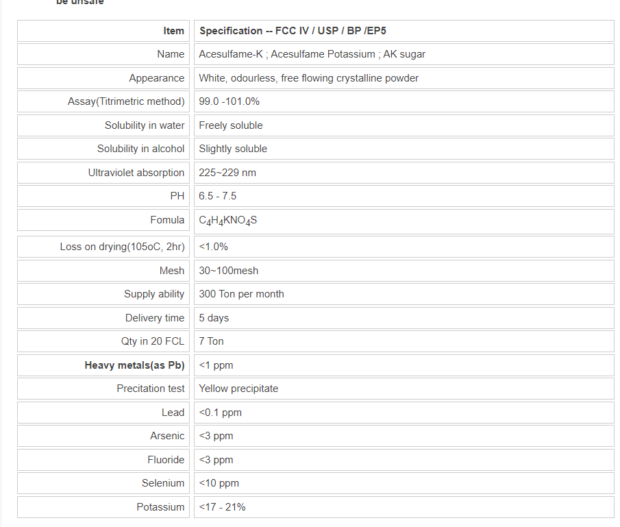 Acesulfame-K and other sweeteners mixed to produce a strong synergistic effect, increase the concentration of the general sweetness of 30% to 50%. 1967, first discovered by the German company Hoechst, 1983 for the first time in the UK approved, Acesulfame-K sweetness of sucrose 200 ~ 250 times. Acesulfame-K to light and heat (225 ℃ high temperature capability) stability, pH, a wider scope of application (pH = 3 to 7), E950 is the worlds stability, one of the best sweeteners, no moisture in the air, The thermal stability. 225 ℃ high temperature capability, PH2 ~ 10 range in the stable, do not use it with other food ingredients or additives react. For baked goods and acidic drinks. In addition,Acesulfame-K was safe, the United Nations Joint FAO / WHO Expert Committee on Food Additives agreed Acesulfame-K for A-level food additives, and recommended daily intake (ADI) of 0 ~ 15mg/kg. In 1988 the U.S. Food and Drug Administration (FDA) approved for use in food Acesulfame-K, provides daily intake (ADI) of 0 ~ 15mg/kg, 1998 The FDA approved use in soft drinks. Acesulfame-K sweet and pure and strong, sweet and lasted longer than sucrose, aspartame 1:1 combined with a significant synergies.
