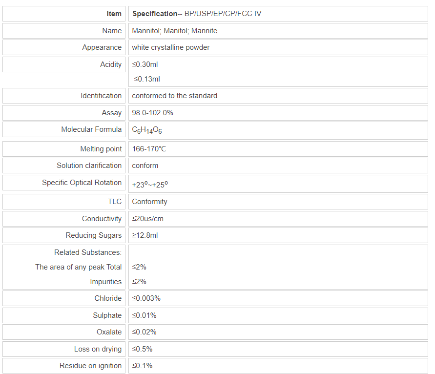 White needle crystal. Melting point 166, the relative density of 1.52,1.489 (20 ℃), boiling point 290-295 ℃ (467kPa). 1g Mannitol E421 can be dissolved in about 5.5ml of water (about 18%, 25 ℃), 83ml alcohol, more soluble in water, soluble in pyridine and aniline, insoluble in ether. Aqueous solution is alkaline. E421 is sorbitol isomerization body, sorbitol hygroscopicity strong, and the product no moisture absorption. E421 sweet, its sweetness equivalent to sucrose 70%.