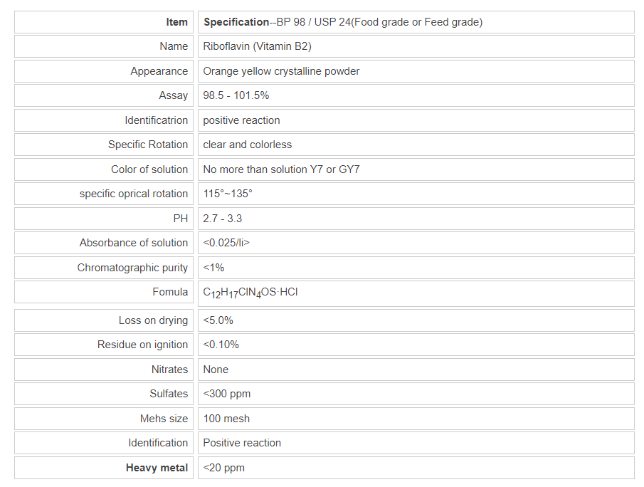 Applications:Vitamin B2 is widely used in wheat flour, dairy and soy sauce, rice, bread, biscuits, chocolate and so on. It is also sometimes used as a pigment.