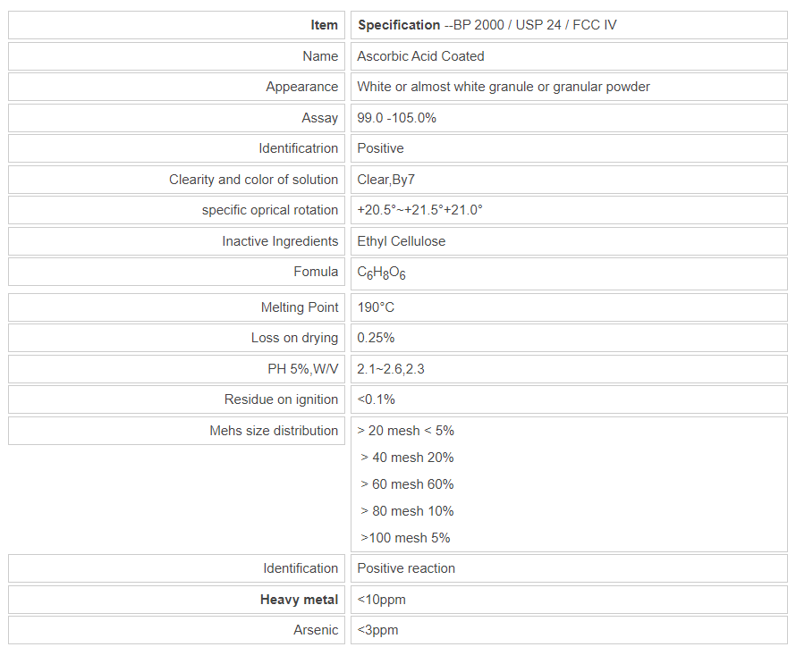 Applications:Ascorbic Acid Coated as a food additive in anti-oxidants, widely used in food, medical care and feed.