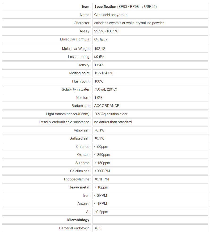 Citric acid anhydrous relative density 1.542, melting point 153 ℃ (dehydration), the refractive index of 1.493 ~ 1.509, E330 is a colorless translucent crystals or white granules, often with part of crystal water, no smell, taste very acid, soluble in water, alcohol and ether. Citric acid anhydrous calcium salt in cold water than hot water easily dissolved, the nature of the citric acid used to identify and separate. Crystallization temperature to control access to the appropriate E330. Acidic aqueous solution. E330 in the dry air of slight weathering in the humid air deliquescence. 175 ℃ above Citric acid anhydrous released by the decomposition of water and carbon dioxide.