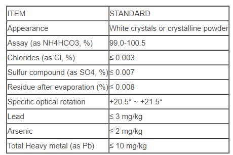 Ammonium Bicarbonate, CAS# 1066-33-7, White powdered crystalline, with weak ammonia odour, with specific gravity 1.586, poor thermal stability, absorbs moisture when exposed to moisture air, decomposed to NH3, CO2 and H2O at 35 degree centigrade, freely soluble in water but insoluble ethanol and acetone.