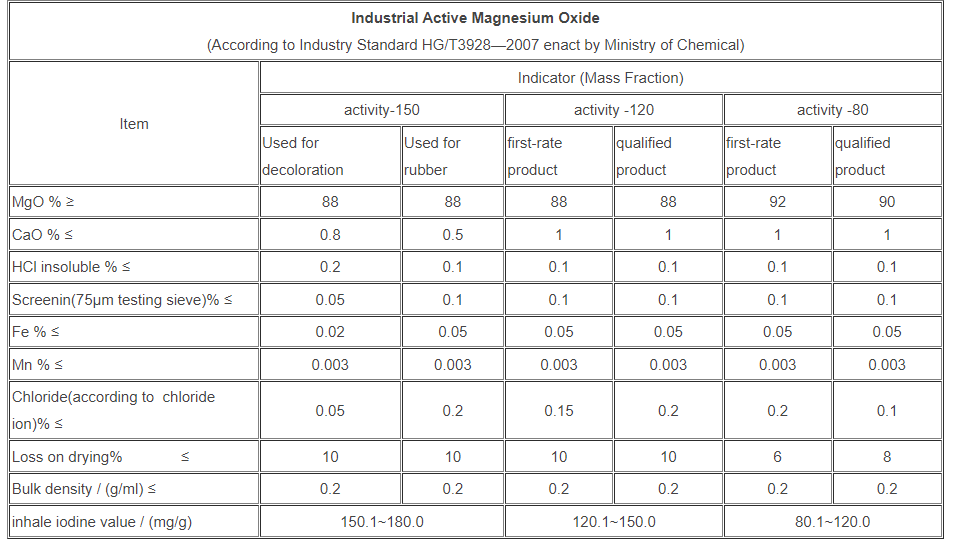 Performance: white light powder, odourless, tasteless, exposed to air, easy to absorb moisture and carbon dioxide, this product is soluble in acid and ammonium salt, insoluble in water and ethanol, melting point 2800, boiling point 3600, magnesium oxide highly refractory insulation performance.