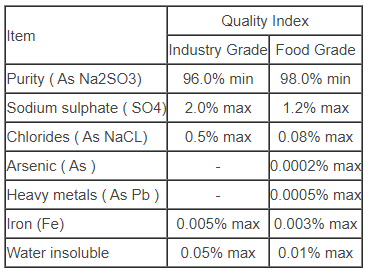 (2) Food Grade: In food industry as additive (E223) preservative, antioxidant and antimicrobic for fruits (dried, glazed and candled), vegetables (onions, potatoes, etc.), juices (citrus and grapes) and fish (shrimps and prawns). In silage treatment as anti-fermentative. In starch and sweeteners production as bacteriostatic.