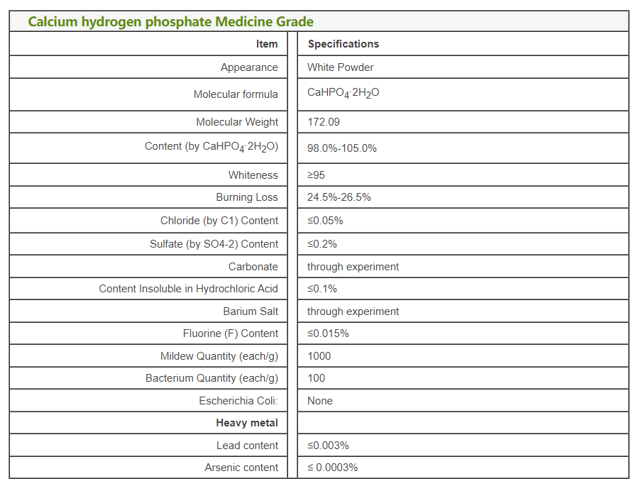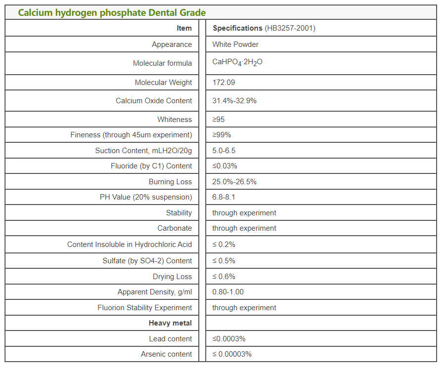Dicalcium phosphate also known as calcium monohydrogen phosphate, is a dibasic calcium phosphate. It is usually found as the dihydrate, with the chemical formula of CaHPO4 • 2H2O, but it can be thermally converted to the anhydrous form. It contains about 29.5 percent calcium in its anhydrous form.