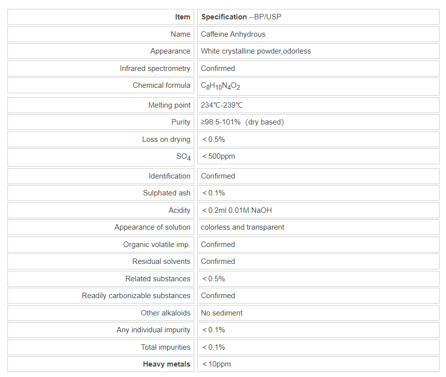 Applications:Caffeine Anhydrous as a food additive used in beverages, tea, cola, cream, chocolate, instant coffee, and other foods.