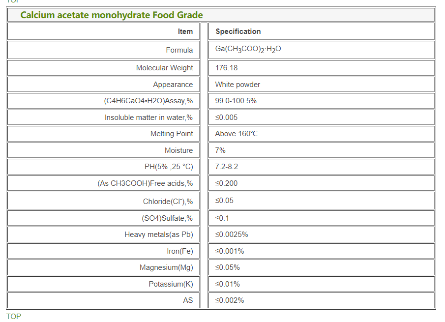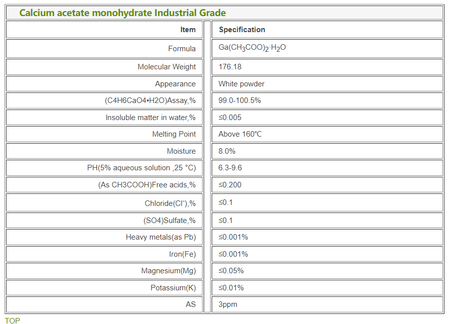 Applications:Calcium Acetate Monohydrate is a common form of Calcium Acetate used as preservative in food production, pharmaceutical, and various other industries.