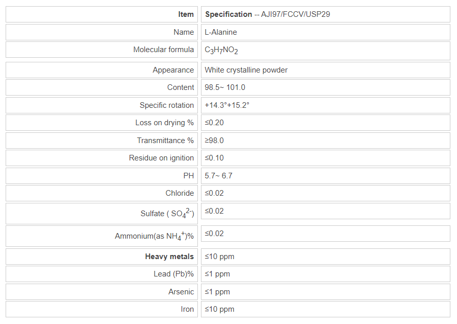 Applications:L-Alanine in food products is mainly used in beverages, bread, dairy products, cakes, etc., to improve to improve the taste of sweetness. L-Alanine or a sugar supply an important part of nutrition infusion. Primarily for the treatment of liver and heart disease.