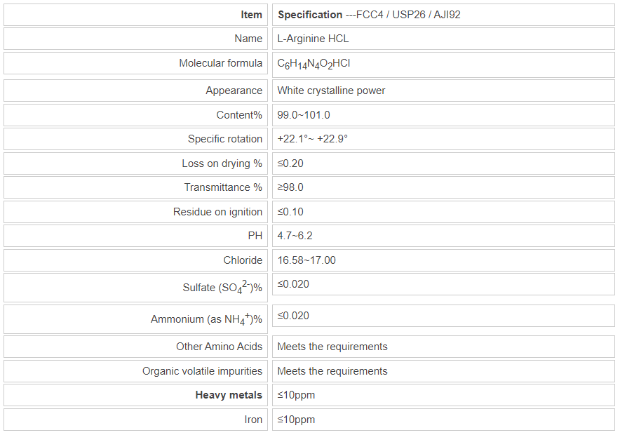 L-Arginine HCL s active ingredient is L-arginine, used in medicine to help heal wounds and stimulate the development of the immune system, enhance the secretion of hormones, promote urinary circulation, lower blood ammonia levels, treatment of ammonia poisoning. L-Arginine HCL acute viral hepatitis, chronic persistent hepatitis and cirrhosis of the liver and has a good therapeutic effect, L-Arginine HCL can prevent and treat fatty liver disease, liver play an effective role.