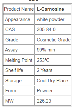 L Carnosine is the most effective anti-carbonylation agent yet discovered. (Carbonylation is a pathological step in the age- related degradation of the body proteins. )Carnosine helps to prevent skin collagen cross-linking which leads to loss of elasticity and wrinkles.